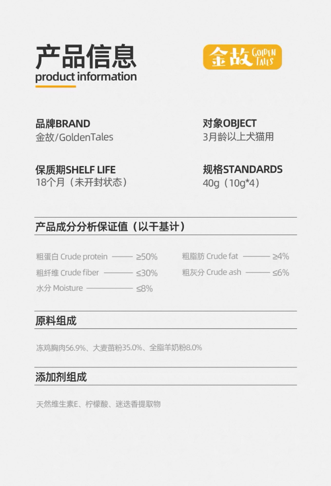Cat Grass: chicken breast 56.9%, barley grass powder 35.0%, whole goat milk powder 8.0%