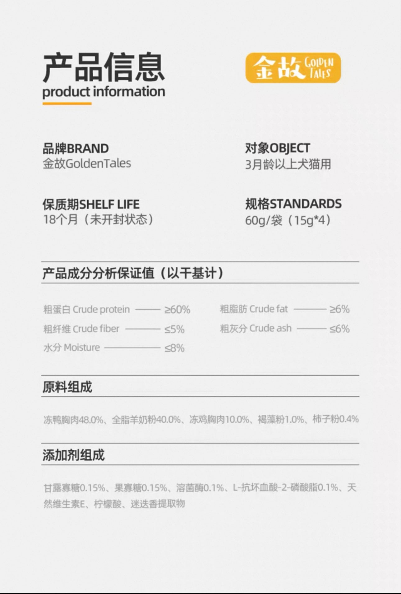 Goat milk sticks: duck breast 48.0%, whole goat milk powder 40.0%, chicken breast 10.0%, brown algae powder 1.0%, Persimmon powder 0.4%