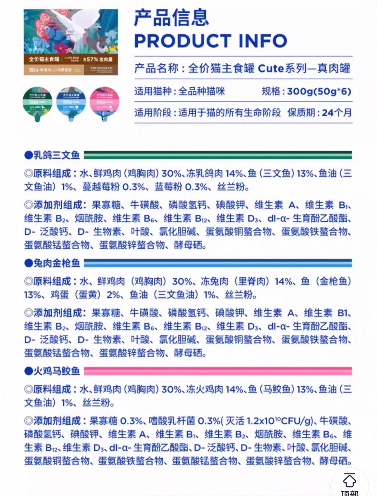 ◎Ingredients: Water, fresh chicken meat (chicken breast) 30%, frozen squab meat 14%, fish (salmon) 13%, fish oil (salmon oil) 1%, cranberry powder 0.3%, blueberry powder 0.3%, yucca powder.