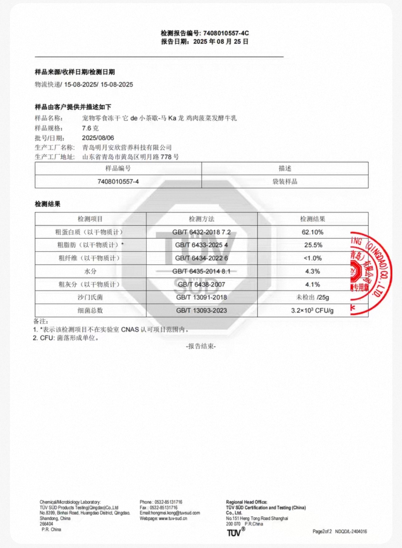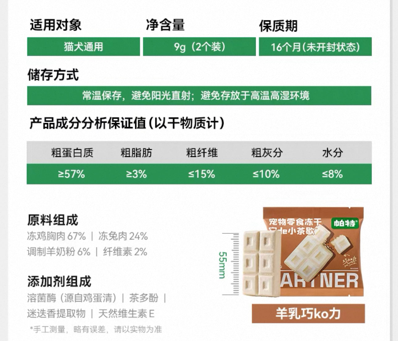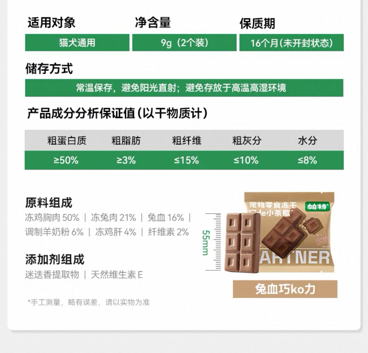 Chicken spinach shortcake ingredients: chicken breast 50% Egg yolk 22% rabbit meat 14% Prepared goat milk powder 9% Fiber 2% Spinach 2%