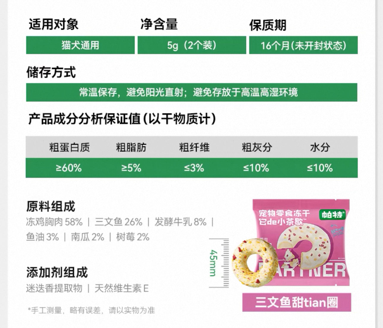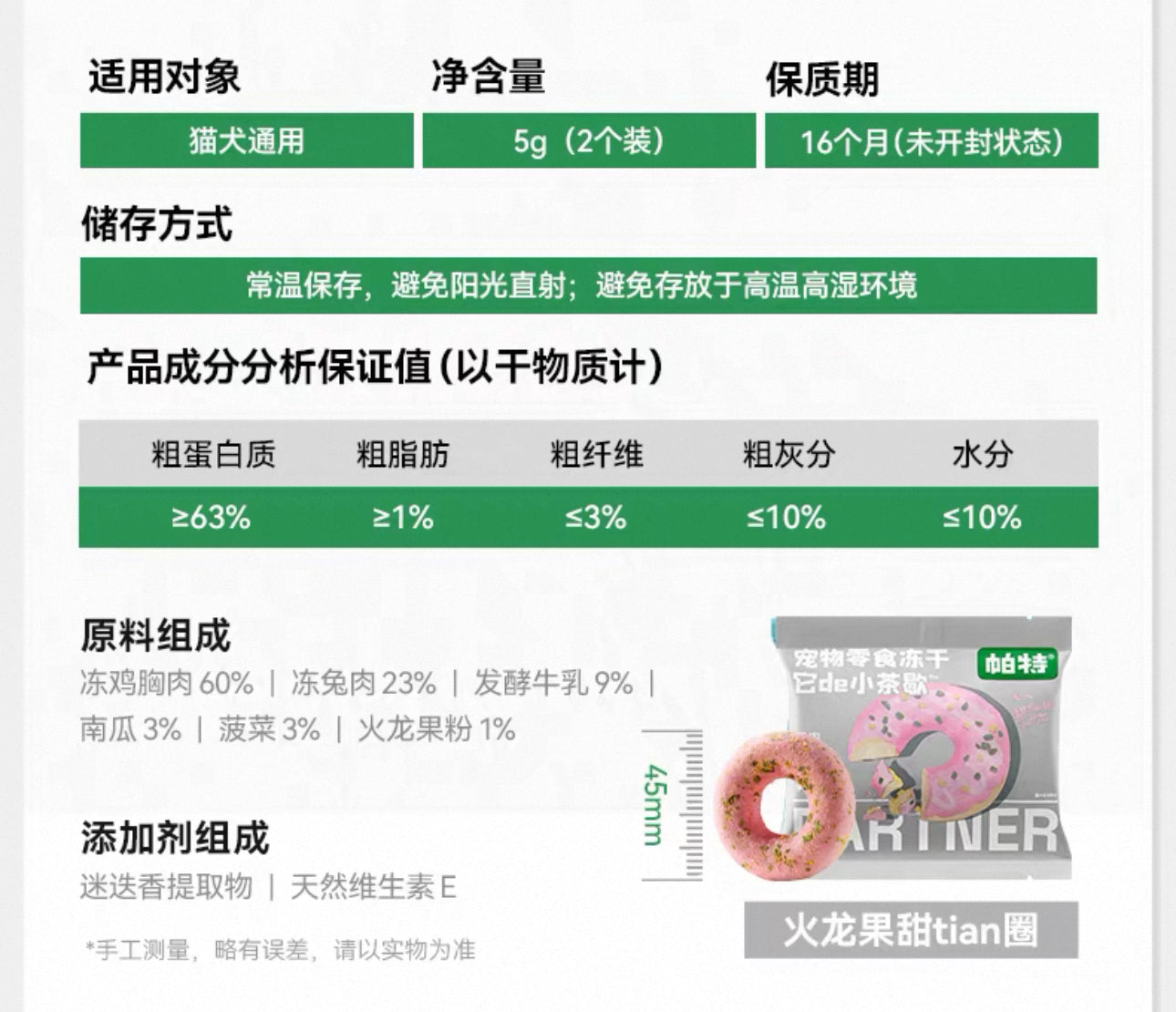 Chicken dragon fruit donut: chicken breast 60% rabbit meat 23% Fermented milk 9% Pumpkin 3% Spinach 3% Dragon fruit powder 1%