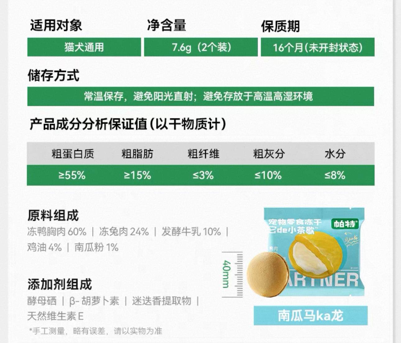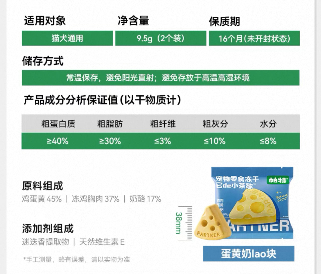 Duck egg yolk shortcake ingredients: duck breast 50% rabbit meat 14% Egg yolk 16% Prepared goat milk powder 13% Frozen chicken liver 5% Glucosamine hydrochloride | Collagen